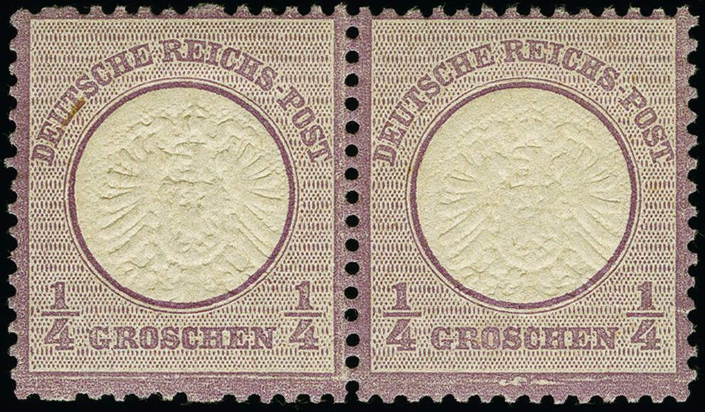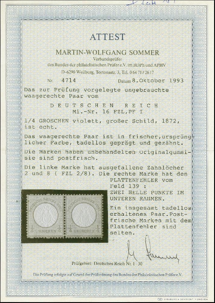 | Zusatzinformationen und Suchstichworte: | 383. Auktion Heinrich Köhler 14.–15. & 18.–23. März 2024 Los 6728 Deutsches Reich, 1872 Grosser Brustschild ¼ Groschen violett mit Plattenfehler "zwei helle Punkte im unteren Rahmen" (Feld 139) im waagerechten Paar mit Normalmarke (diese mit FLZ ou2/8), postfrisch und in tadelloser Erhaltung, unsigniert mit Fotoattest Sommer BPP (1993) Ausruf 200,00 EUR |