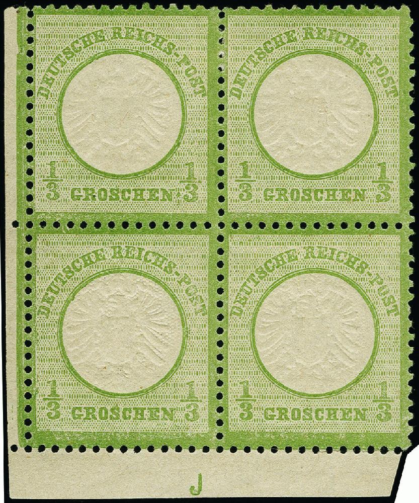 | Zusatzinformationen und Suchstichworte: | 383. Auktion Heinrich Köhler 14.–15. & 18.–23. März 2024 Los 6738 Deutsches Reich, 1872 Grosser Brustschild ⅓ Groschen gelblichgrün im Viererblock aus der linken unteren Bogenecke mit Plattenkennzeichen "J" im Rand unter Feld 141, die beiden unteren Marken im Format L16. Die rechte obere Marke hat eine helle Stelle, sonst ist die farbfrische, ungebrauchte Einheit in guter Gesamterhaltung, wir haben nur ein ungebrauchtes Paar und zwei ungebrauchte Viererblocks mit dem Buchstaben “J“ registriert, Fotoattest Hennies BPP (1979) Ausruf 300,00 EUR |