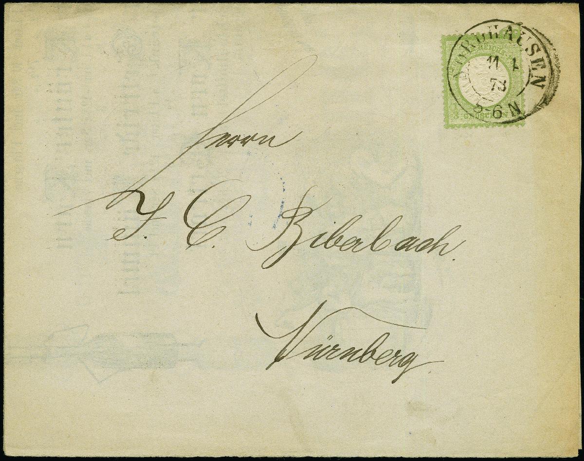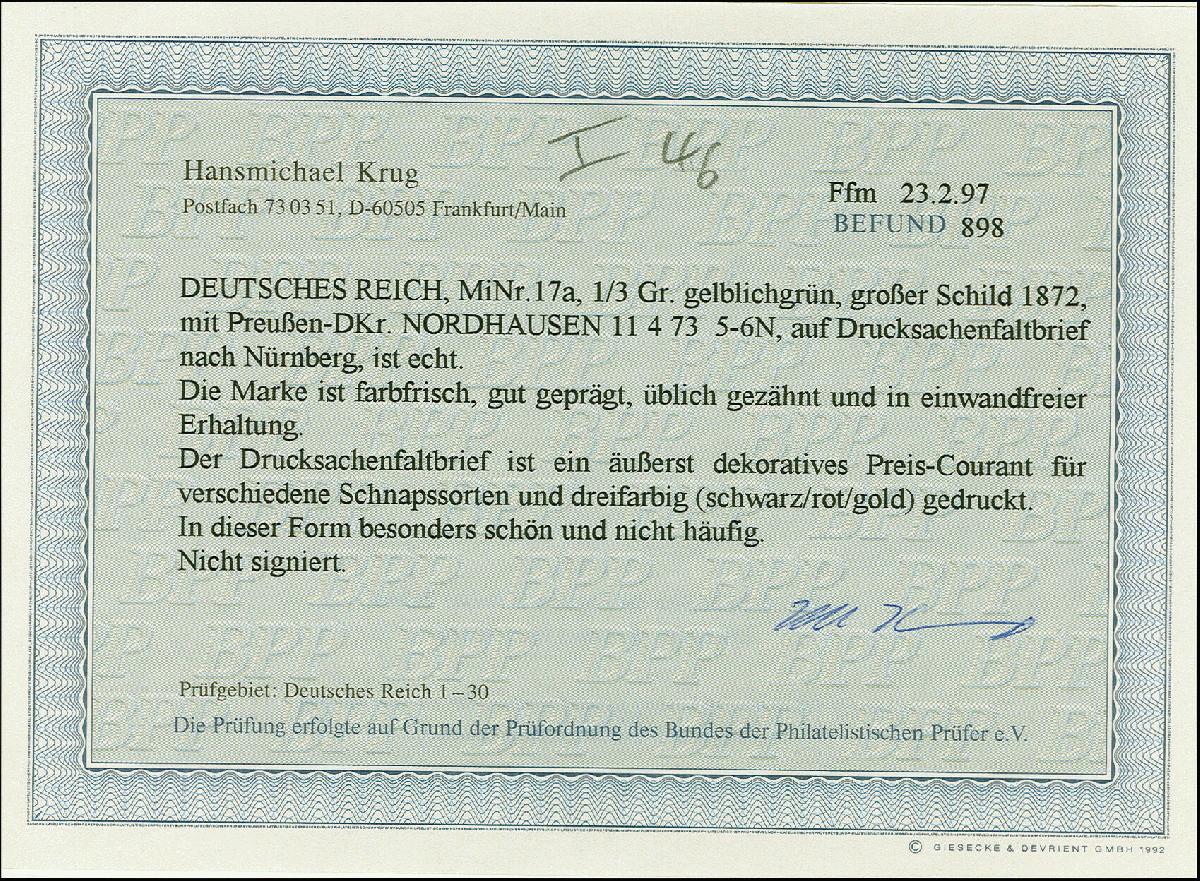 | Zusatzinformationen und Suchstichworte: | 383. Auktion Heinrich Köhler 14.–15. & 18.–23. März 2024 Los 6746 Deutsches Reich, 1872 Grosser Brustschild ⅓ Groschen gelblichgrün mit DKr. "NORDHAUSEN 11.4.73" auf komplettem Drucksachen-Faltbrief mit innen mehrfarbiger Werbung der Firma Anton Wisse "Alter Nordhäuser Doppelkorn" mit Abbildung von Flaschen und Zwergen mit Fässern, adressiert nach Nürnberg mit Ankunftsstempel in einwandfreier Erhaltung, Fotobefund Krug BPP (1997) Ausruf 100,00 EUR |