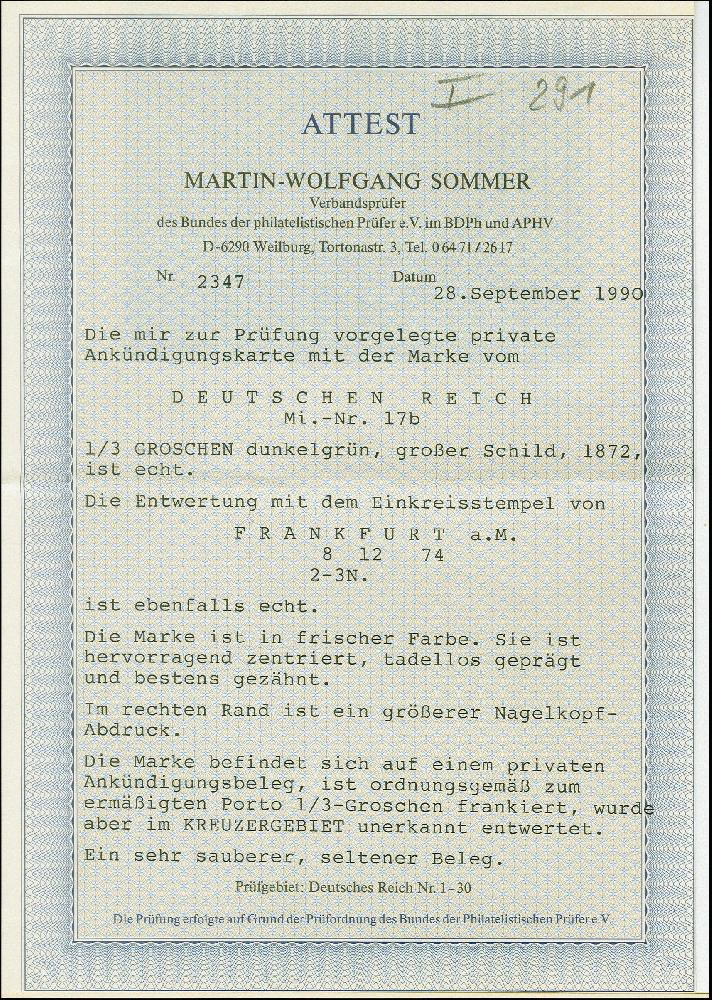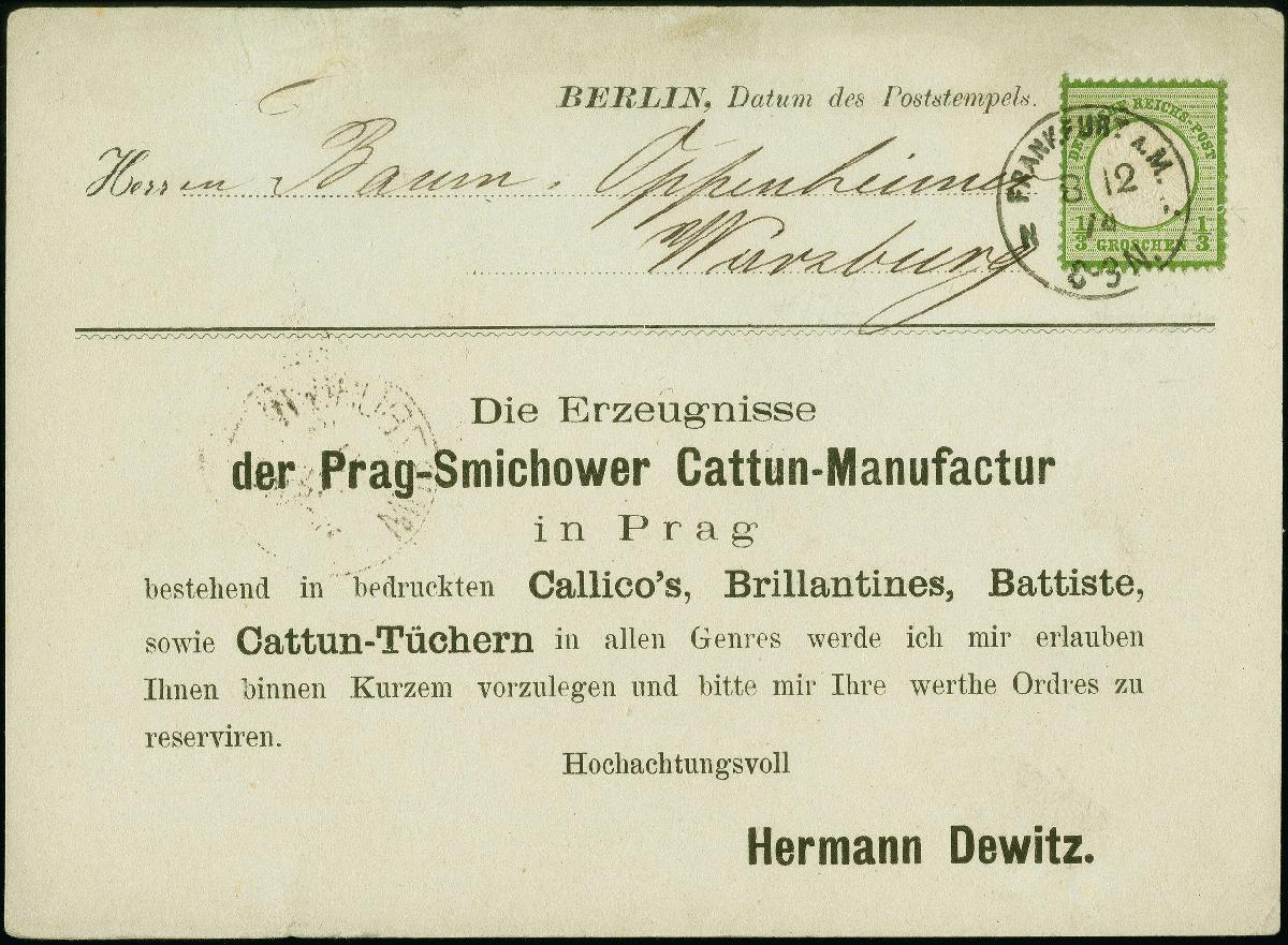 | Zusatzinformationen und Suchstichworte: | 383. Auktion Heinrich Köhler 14.–15. & 18.–23. März 2024 Los 6749 Deutsches Reich, 1872 Grosser Brustschild ⅓ Groschen dunkelolivgrün mit klarem EKr. "FRANKFURT A.M. N1 8.12.74" auf Drucksachen-Vertreterkarte der Firma "Prag-Smichower Cattun-Manufactur" nach Würzburg mit Ankunftsstempel. Die farbfrische Marke ist sehr gut geprägt, sehr gut gezähnt und in einwandfreier Erhaltung, die Karte mit leichten Beförderungsspuren. Attraktive und äußerst seltene währungsfremde Verwendung der 1/3 Groschen-Marke in der b-Farbe im Kreuzer-Gebiet, Fotoattest Sommer BPP (1990) Ausruf 250,00 EUR |