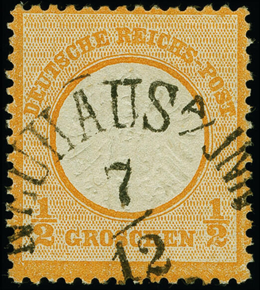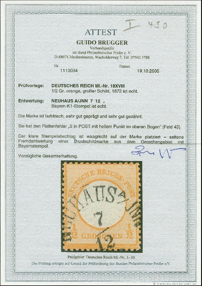 | Zusatzinformationen und Suchstichworte: | 383. Auktion Heinrich Köhler 14.–15. & 18.–23. März 2024 Los 6754 Deutsches Reich, 1872 Grosser Brustschild ½ Groschen orange mit Plattenfehler "S in POST mit hellem Punkt im oberen Bogen" (Feld 43), farbfrisches Exemplar mit klarem bayrischen Stempel "NEUHAUS A/INN 7.12" in tadelloser Erhaltung, sehr dekorative und seltene Fremdentwertung aus einem Kreuzer-Gebiet, Fotoattest Brugger BPP (2005) Ausruf 150,00 EUR |