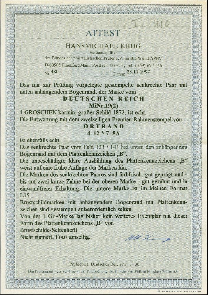 | Zusatzinformationen und Suchstichworte: | 383. Auktion Heinrich Köhler 14.–15. & 18.–23. März 2024 Los 6778 Deutsches Reich, 1872 Grosser Brustschild 1 Groschen karmin im senkrechten Unterrandpaar mit Plattenkennzeichen "B" unter Feld 141, Marken von unten gezähnt, mit klarem Rahmenstempel "ORTRAND 4.12.". Die untere Marke ist im kleinen Format L15 und das Paar ist bis auf zwei kurze Zähne bei der oberen Marke in einwandfreier Erhaltung. Ein dekoratives Paar mit seltenem Plattenkennzeichen, bisher sind nur wenige gestempelte Exemplare dieser Art bekannt, Fotoattest Krug BPP (1997) Ausruf 600,00 EUR |