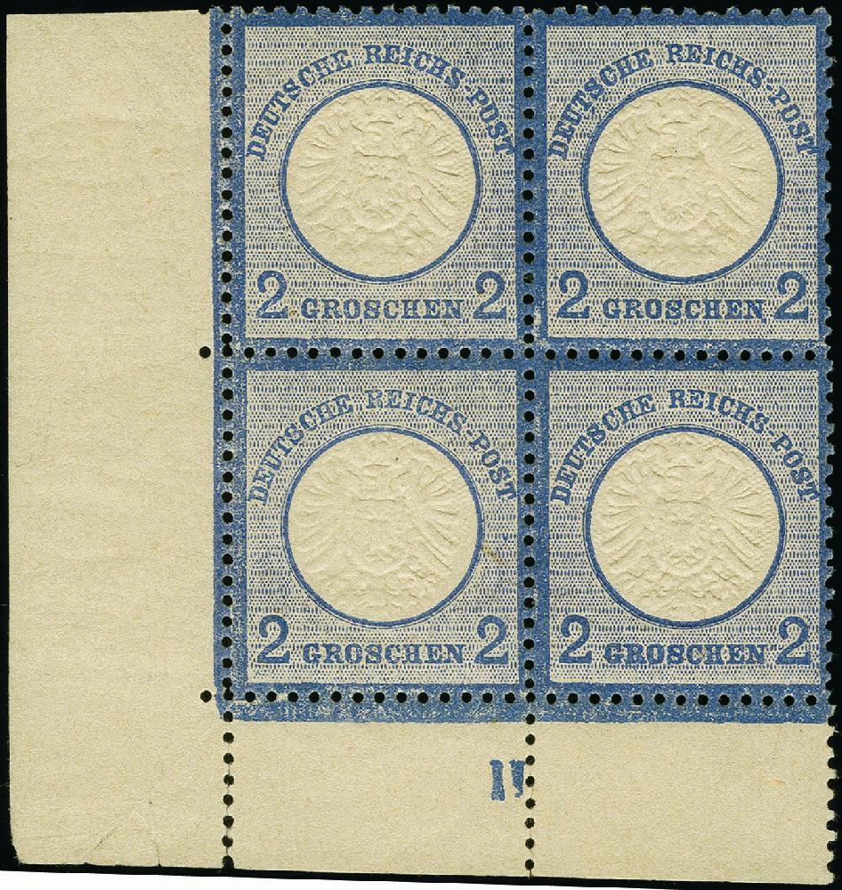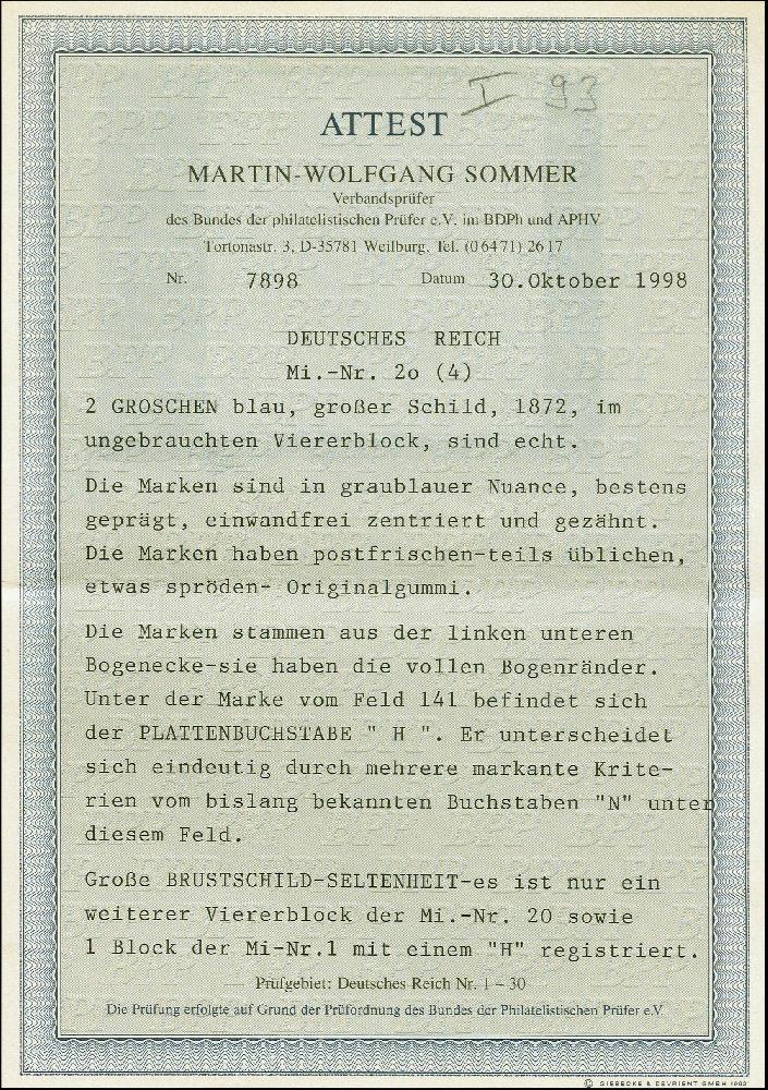 | Zusatzinformationen und Suchstichworte: | 383. Auktion Heinrich Köhler 14.–15. & 18.–23. März 2024 Los 6812 Deutsches Reich, 1872 Grosser Brustschild 2 Groschen blau im Viererblock aus der linken unteren Bogenecke mit Plattenkennzeichen "H" unter Feld 141, Marken von oben gezähnt. Die rechte obere Marke ist ungebraucht, die anderen Marken postfrisch und in einwandfreier Erhaltung, interessante Einheit mit sehr seltenem Plattenkennzeichen, unsigniert mit Fotoattest Sommer BPP (1998) Ausruf 500,00 EUR |