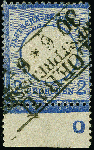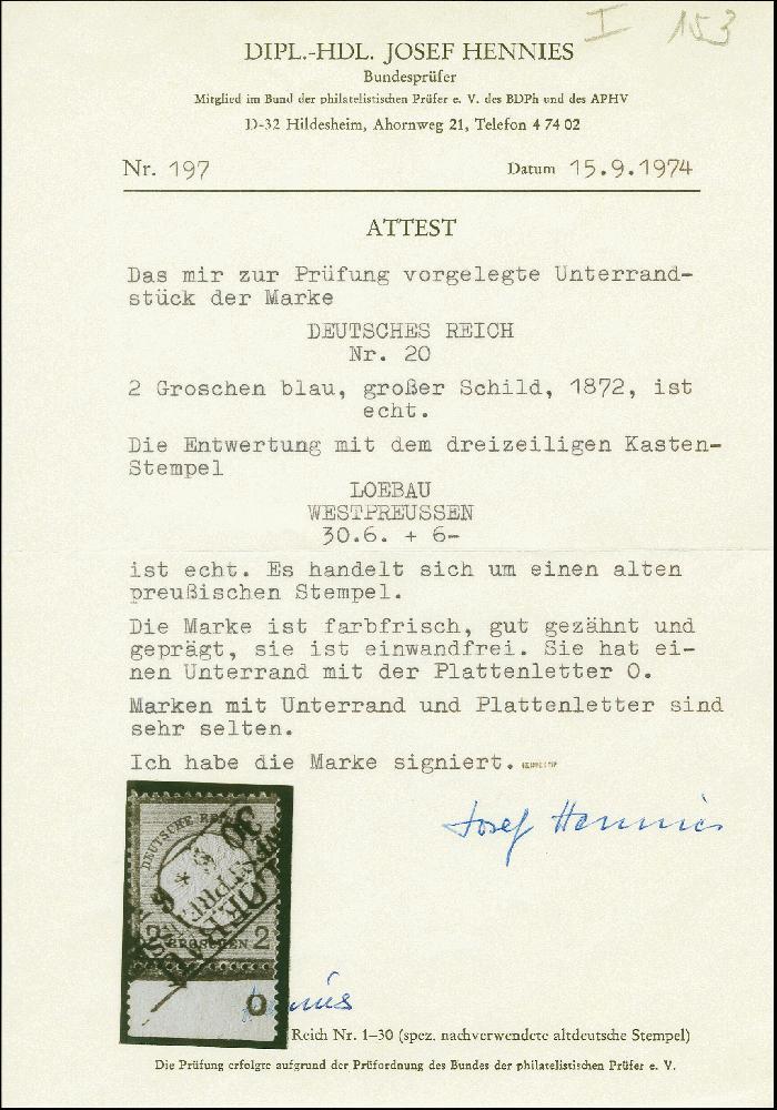 | Zusatzinformationen und Suchstichworte: | 383. Auktion Heinrich Köhler 14.–15. & 18.–23. März 2024 Los 6814 Deutsches Reich, 1872 Grosser Brustschild 2 Groschen blau, farbfrisches Unterrandstück mit Plattenkennzeichen "O" unter Feld 141, Marke von oben gezähnt, sauber mit Rahmenstempel "LOEBAU WESTPREUSSEN 30.6.". Die Marke ist gut geprägt, gut gezähnt und in einwandfreier Erhaltung. Alle gestempelten Randmarken mit Plattenkennzeichen sind außerordentlich selten, diese Variante ist bisher nur zweimal registriert, signiert Barkemeyer im Unterrand und Hennies BPP mit Fotoattest (1974) Ausruf 500,00 EUR |