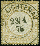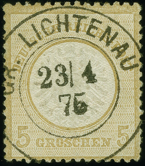 | Zusatzinformationen und Suchstichworte: | 383. Auktion Heinrich Köhler 14.–15. & 18.–23. März 2024 Los 6839 Deutsches Reich, 1872 Grosser Brustschild 5 Groschen ockerbraun mit klarem DKr. "GR. LICHTENAU 23.4.75" in einwandfreier Erhaltung, nicht häufiger neuer Postort-Stempel aus der OPD Danzig und späte Verwendung zur Pfennig-Zeit Ausruf 80,00 EUR |