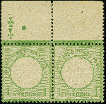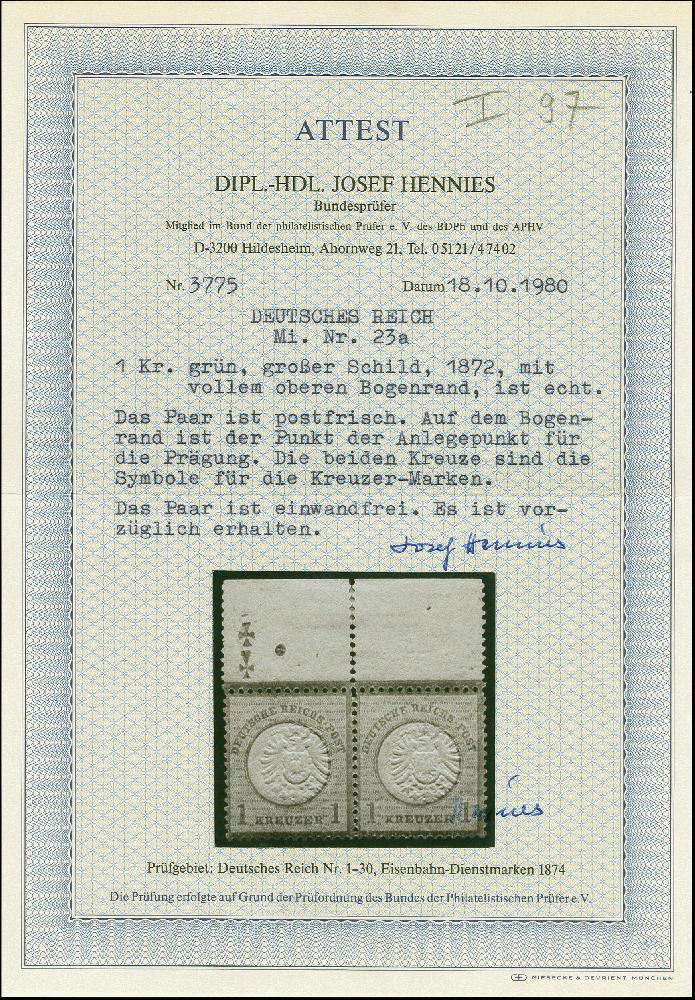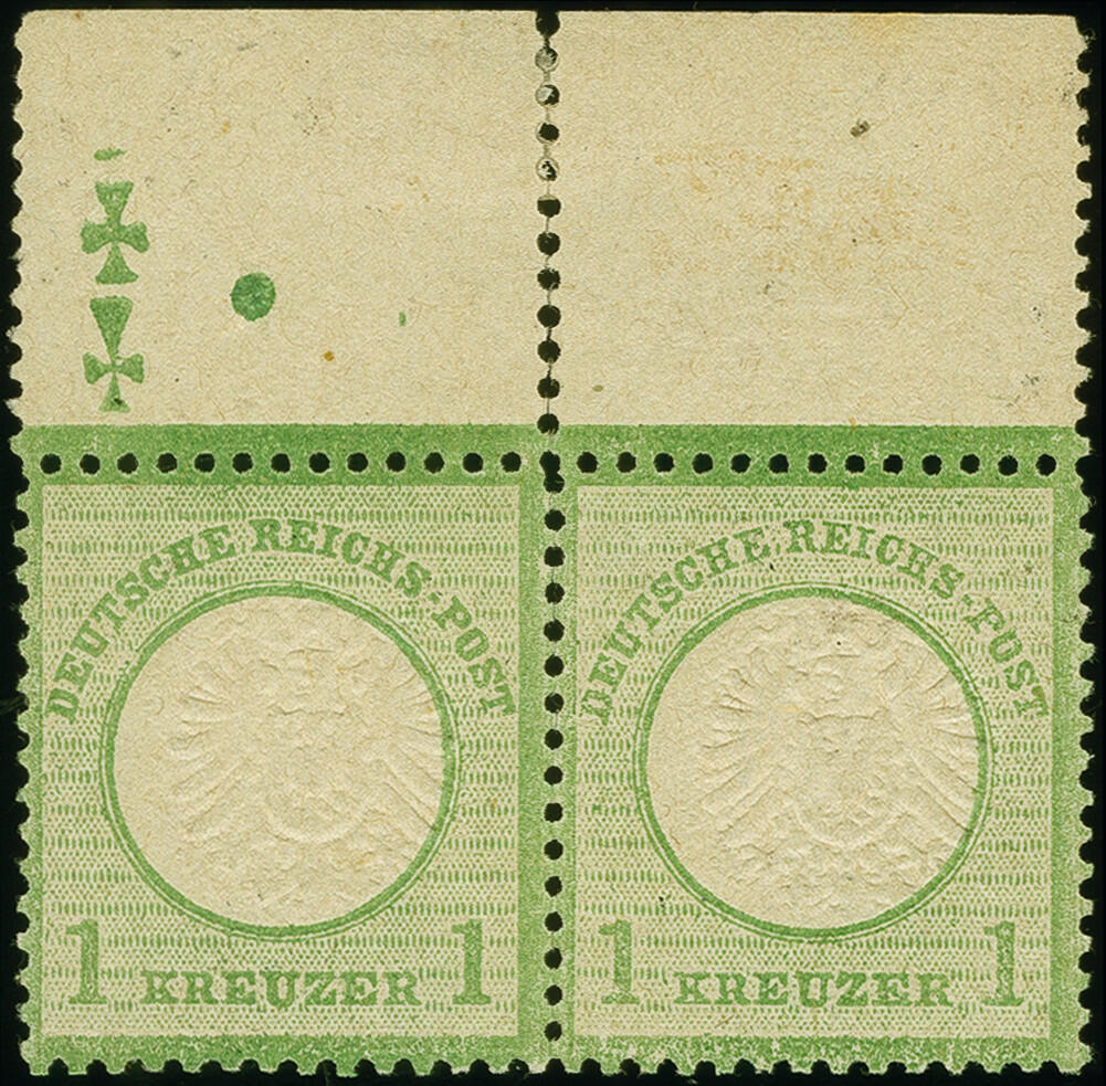 | Zusatzinformationen und Suchstichworte: | 383. Auktion Heinrich Köhler 14.–15. & 18.–23. März 2024 Los 6844 Deutsches Reich, 1872 Grosser Brustschild 1 Kreuzer grün im waagerechten Oberrandpaar mit Plattenkennzeichen "kopfstehende Kreuze - tiefstehend" über Feld 6 und Anlegepunkt für die Zähnung, Marken von unten gezähnt. Die postfrischen Marken sind farbfrisch, gut geprägt, sehr gut gezähnt und in einwandfreier Erhaltung, Falzreste im Oberrand und dort stärker angetrennt. Ein dekoratives Paar mit seltenem Plattenkennzeichen, dieses ist bisher nur viermal registriert, rechte Marke mit Privat-Signatur und Fotoattest Hennies BPP (1980) Ausruf 400,00 EUR |