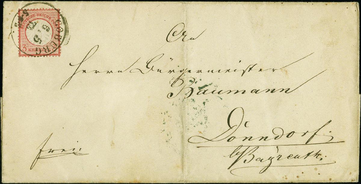 | Zusatzinformationen und Suchstichworte: | 383. Auktion Heinrich Köhler 14.–15. & 18.–23. März 2024 Los 6866 Deutsches Reich, 1872 Grosser Brustschild 3 Kreuzer karmin mit Plattenfehler "beschädigter Kreis links über der rechten Wertziffer", sauber mit EKr. "COBURG 6.5.73" auf Faltbriefhülle nach Donndorf bei Bayreuth mit Ankunftsstempel. Die Briefhülle mit senkrechter Faltung und Patina, die farbfrische Marke ist in einwandfreier Erhaltung, Fotoattest Sommer BPP (1993) Ausruf 200,00 EUR |