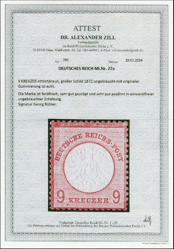 | Zusatzinformationen und Suchstichworte: | 383. Auktion Heinrich Köhler 14.–15. & 18.–23. März 2024 Los 6877 Deutsches Reich, 1872 Grosser Brustschild 9 Kreuzer rötlichbraun, farbfrisch, sehr gut geprägt und sehr gut gezähnt, ungebraucht mit voller Originalgummierung, in tadelloser Erhaltung, signiert Bühler und Fotoatteste Sommer BPP (1990) und Dr. Zill BPP (2024) Ausruf 200,00 EUR |