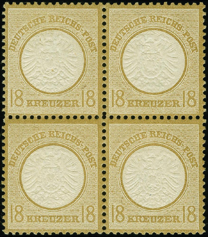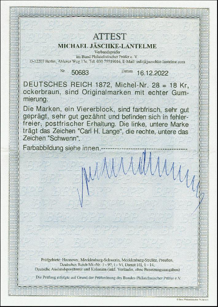 | Zusatzinformationen und Suchstichworte: | 383. Auktion Heinrich Köhler 14.–15. & 18.–23. März 2024 Los 7007 Deutsches Reich, 1872 Grosser Brustschild 18 Kreuzer ockerbraun im Viererblock, postfrisch, in tadelloser Erhaltung, zwei Werte signiert Carl H. Lange bzw. Schwenn und Fotoattest Jäschke-L. BPP (2022) Ausruf 100,00 EUR |