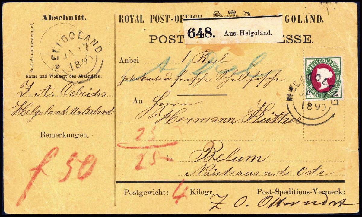 | Zusatzinformationen und Suchstichworte: | Württembergisches Auktionshaus 140. Versteigerung Auktionstermin: 17. - 18. Juni 2022 Los 2424 Altdeutschland Helgoland 50 Pfg., Kabinettstück mit sauber aufges. Stempel HELIGOLAND JA 17 1890 auf kompletter Helgoländer Paketkarte (mit Coupon) für einen Korb geräucherte und frische Schellfische nach Belum (4 kg), li. auf dem Abschnitt mit Portovermerk "f 50". Paketkarten von Helgoland sind generell selten, das hier gezeigte komplette Exemplar mit dem Abschnitt und einer 50-Pfg.-Einzelfrankatur stellt eine besondere Rarität dar, Fotoattest Brettl BPP. Ausruf 3200,00 EUR |