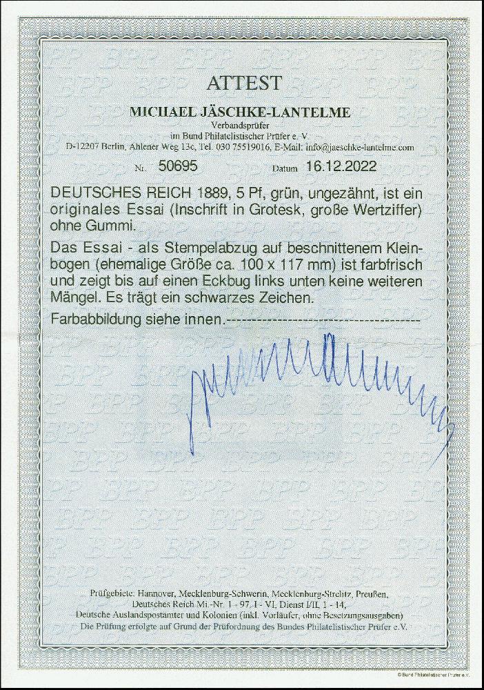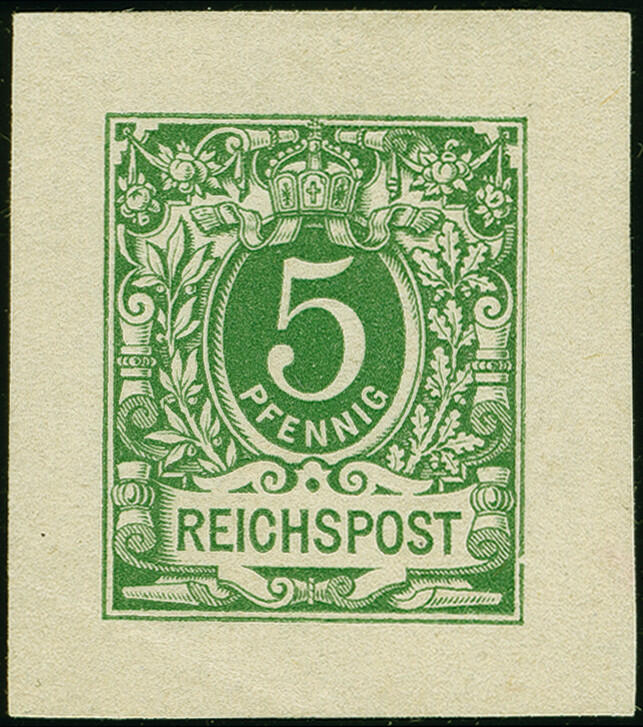 | Zusatzinformationen und Suchstichworte: | 383. Auktion Heinrich Köhler 14.–15. & 18.–23. März 2024 Los 7012 Deutsches Reich, 1889 Krone/Adler 1889, 5 Pfennig Essay (große Wertziffer, Inschrift in Grotesk) in Grün als Stempelabzug aus beschnittenem Kleinbogen, ungebraucht ohne Gummierung, links unten mit Eckbug (Markenbild leicht betroffen), sonst in einwandfreier Erhaltung, Fotoattest Jäschke-L. BPP (2022) Ausruf 100,00 EUR |
