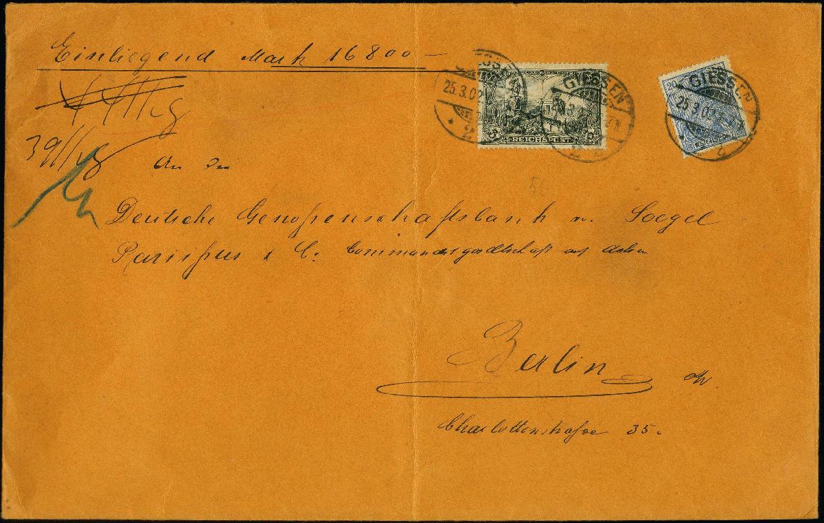 | Zusatzinformationen und Suchstichworte: | 383. Auktion Heinrich Köhler 14.–15. & 18.–23. März 2024 Los 2150 Deutsches Reich, Germania Reichspost 1900, 3 Mark violettschwarz, Type I, mit Zufrankatur Germania 20 Pfennig auf portogerechten Wertbrief über 16.800 Mark von "GIESSEN 25.3.02" nach Berlin, Umschlag mit senkrechter Faltung, Marken in tadelloser Erhaltung, Fotoattest Jäschke-L. BPP (2023) Ausruf 300,00 EUR |