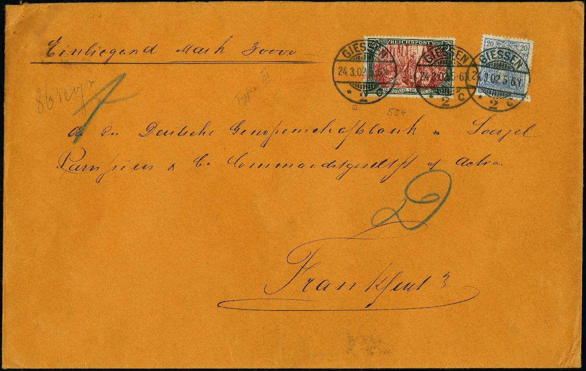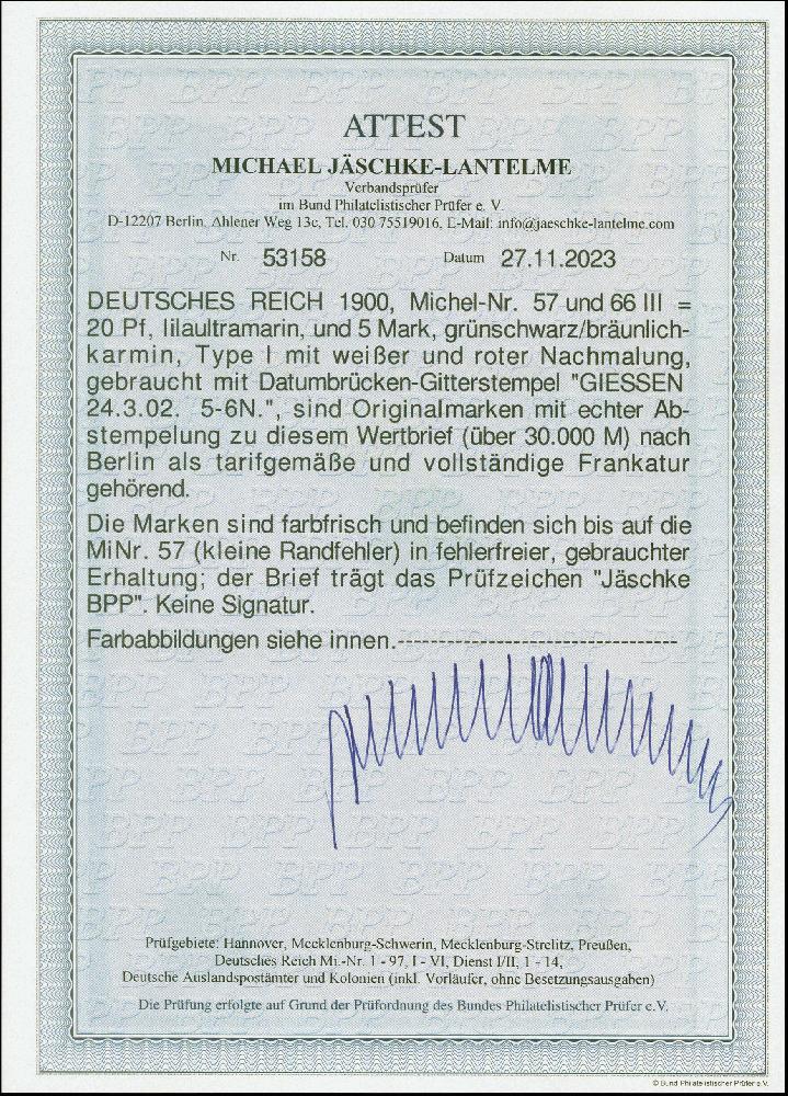| Zusatzinformationen und Suchstichworte: | 383. Auktion Heinrich Köhler 14.–15. & 18.–23. März 2024 Los 2151 Deutsches Reich, Germania Reichspost 1900, 5 Mark grünschwarz/bräunlichkarmin, Type III mit roter und weißer Nachmalung mit Zufrankatur Germania 20 Pfennig auf portogerechten Wertbrief über 30.000 Mark von "GIESSEN 24.3.02" nach Berlin, bis auf 20 Pfennig Wert in tadelloser Erhaltung, dieser mit fehlendem Eckzahn und kleinen Einriss, signiert Jäschke BPP und Fotoattest Jäschke-L. BPP (2023) Ausruf 500,00 EUR |