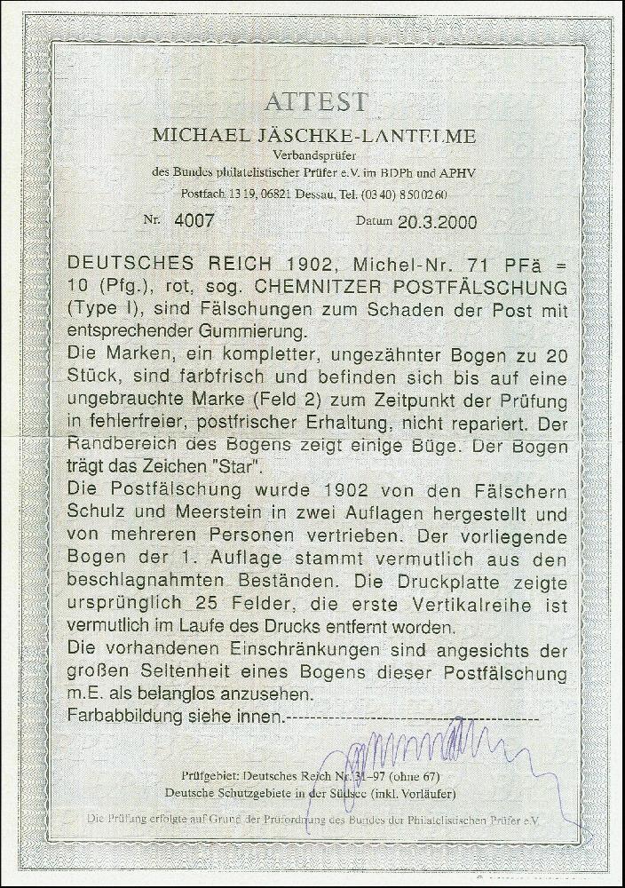 | Prüfgebiet: | Deutsches Reich 1871 - 1918 (Mi-Nr. 1 - 106) |