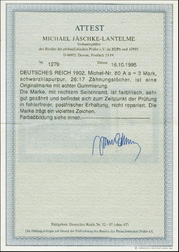 | Prüfer: | Jäschke-Lantelme, Michael (BPP (Bund Philatelistischer Prüfer)) |