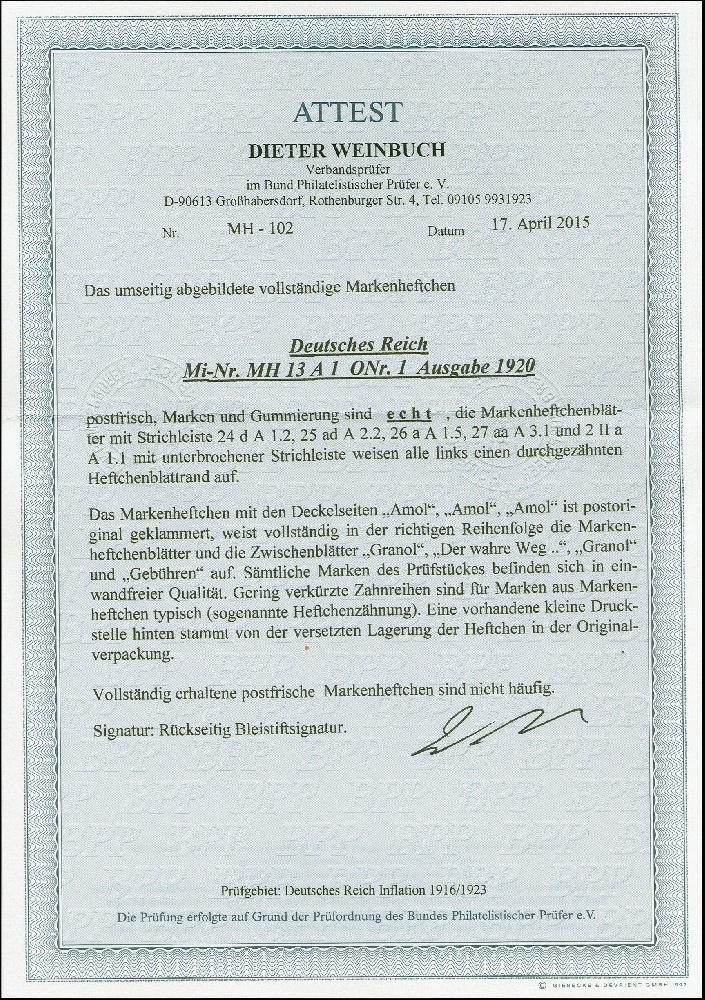 | Prüfgebiet: | Deutsches Reich Markenheftchen u. Zusammendrucke 1900 - 1945 |