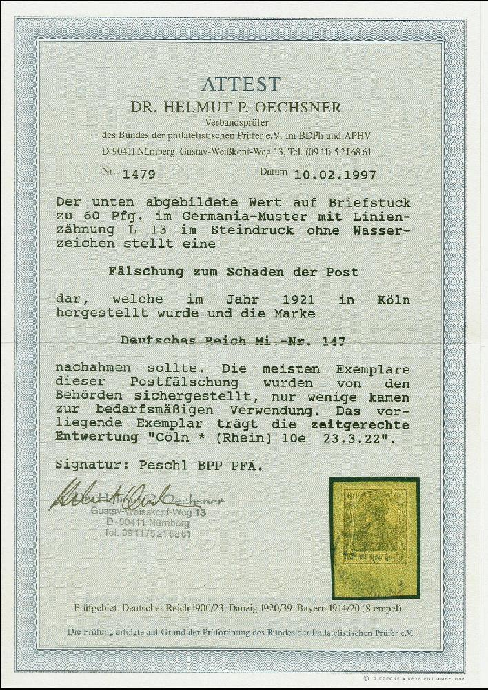 | Zusatzinformationen und Suchstichworte: | 383. Auktion Heinrich Köhler 14.–15. & 18.–23. März 2024 Los 7020 Deutsches Reich, Germania mit WZ 1920, Kölner Postfälschung 60 Pfennig mit Stempel "CÖLN (RHEIN) 10 29.3.22" auf Briefstück in einwandfreier Erhaltung, ein schönes Exemplar aus dem Bedarf, gestempelt sind bisher nur wenige Stücke bekannt, signiert Peschl BPP und Fotoatteste Oechsner BPP (1997) und Bauer BPP (2022) Ausruf 400,00 EUR |