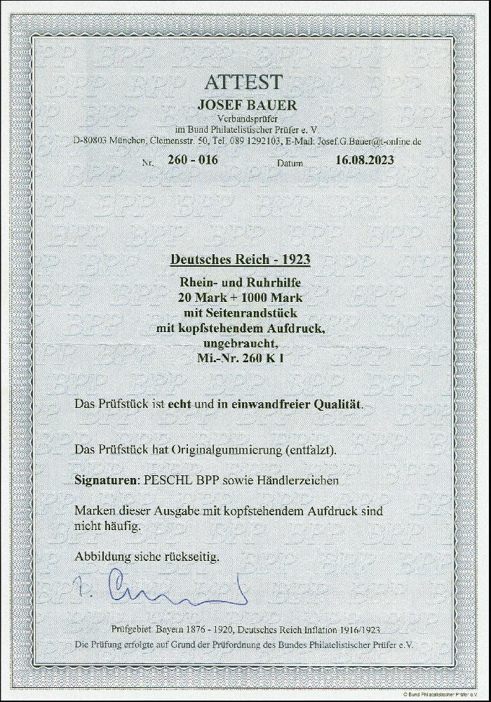 | Zusatzinformationen und Suchstichworte: | 383. Auktion Heinrich Köhler 14.–15. & 18.–23. März 2024 Los 2167 Deutsches Reich, 1918/23 Inflationsausgaben 1923, Rhein- und Ruhrhilfe 20 Mark+1000 Mark mit kopfstehendem Aufdruck, rechtes Seitenrandstück (winzig angetrennt), sauber ungebraucht, eine sehr seltene Abart, u.a. sign. Peschl BPP sowie Kurt Maier und Fotoattest Bauer BPP (2023) Ausruf 250,00 EUR |