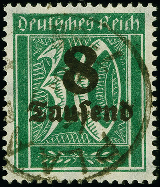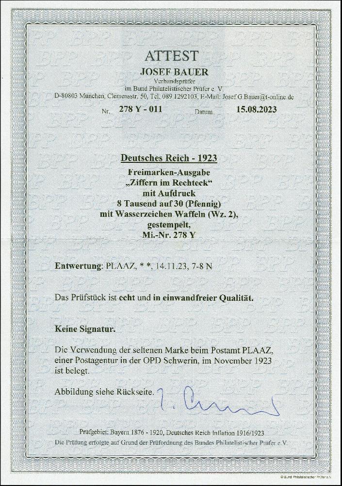 | Zusatzinformationen und Suchstichworte: | 383. Auktion Heinrich Köhler 14.–15. & 18.–23. März 2024 Los 2168 Deutsches Reich, 1918/23 Inflationsausgaben 1923, 8 Tausend auf 30 Pfennig mit Wasserzeichen 2, sauber mit Stempel "PLAAZ 14.11.23", tadellos, sehr schönes Exemplar dieser gestempelt seltenen Marke, Fotoattest Bauer BPP (2023) Ausruf 2.000,00 EUR |