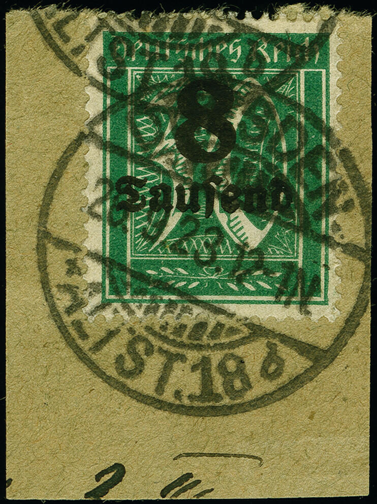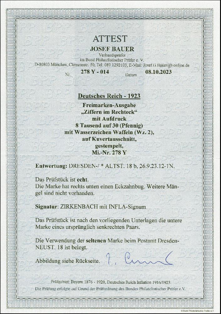 | Zusatzinformationen und Suchstichworte: | 383. Auktion Heinrich Köhler 14.–15. & 18.–23. März 2024 Los 2169 Deutsches Reich, 1918/23 Inflationsausgaben 8 Tsd. auf 30 Pfg. mit Wasserzeichen Waffeln, sauber mit Stempel "DRESDEN 26.9.23" auf Briefstück, rechts unten kaum merklicher Eckzahnbug, sonst tadellos, ein sehr schönes Stück dieser seltenen Marke, sign. Zirkenbach sowie Fotoattest Bauer BPP (2023) Ausruf 1.000,00 EUR |