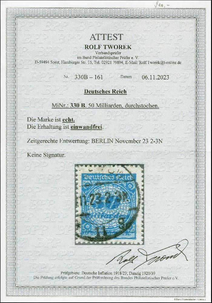 | Zusatzinformationen und Suchstichworte: | 383. Auktion Heinrich Köhler 14.–15. & 18.–23. März 2024 Los 2174 Deutsches Reich, 1918/23 Inflationsausgaben 1923, 50 M. , farbfrisch, zeitgerechter Stempel "BERLIN 11 23 2-3N", einwandfrei, FA Tworek BPP (2023) Ausruf 150,00 EUR |