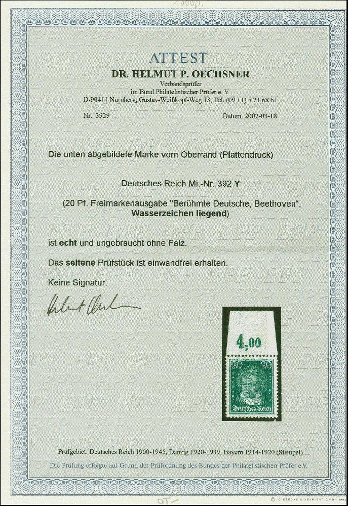 | Zusatzinformationen und Suchstichworte: | 383. Auktion Heinrich Köhler 14.–15. & 18.–23. März 2024 Los 2179 Deutsches Reich, 1923/32 Weimarer Republik 20 Pfg. mit liegendem Wz., Oberrandstück (stärker gefaltet), unmerklich entfalzt, einwandfrei. Fotoattest Dr. Oechsner BPP (2002) Ausruf 500,00 EUR |