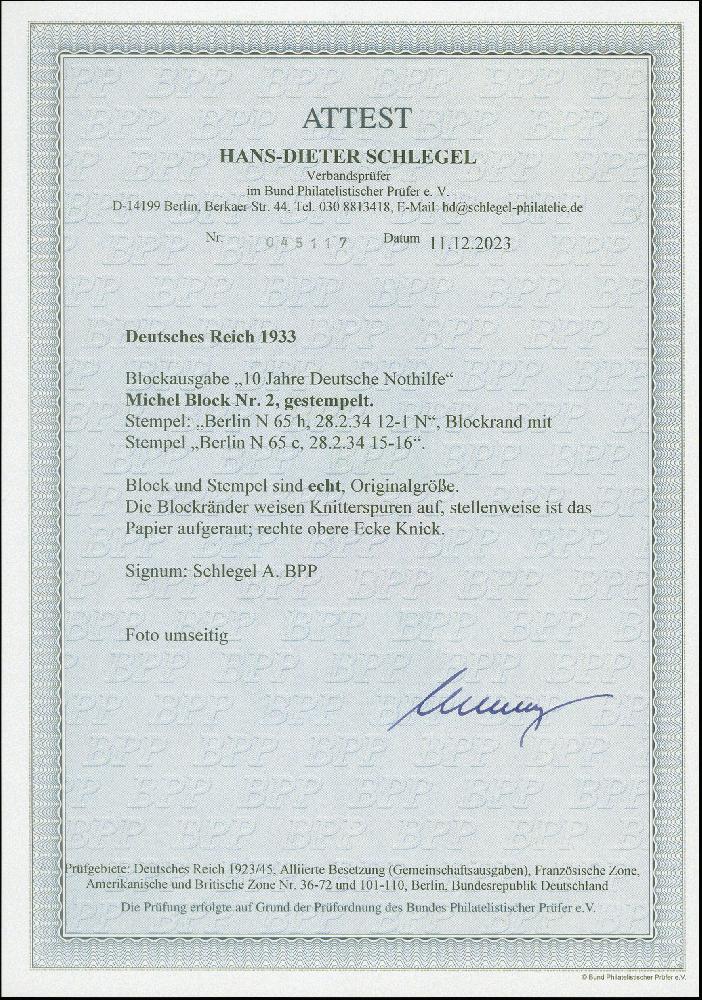 | Zusatzinformationen und Suchstichworte: | 383. Auktion Heinrich Köhler 14.–15. & 18.–23. März 2024 Los 2200 Deutsches Reich, 1933/45 Drittes Reich 1933, Nothilfe-Block, sauber gestempelt "BERLIN 28.2.34", Blockränder mit leichten Knitterspuren und stellenweise leicht aufgeraut, rechte obere Ecke mit Stauchung, sonst tadellos, signiert Schlegel A. BPP und Fotoattest H.-D. Schlegel BPP (2023) Ausruf 1.400,00 EUR |