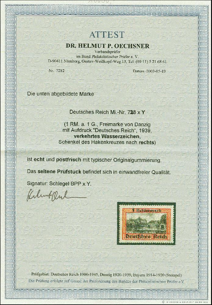 | Zusatzinformationen und Suchstichworte: | 383. Auktion Heinrich Köhler 14.–15. & 18.–23. März 2024 Los 2248 Deutsches Reich, 1933/45 Drittes Reich 1939, Danzig Abschied 1 RM. mit seitenverkehrtem Wasserzeichen (Schenkel nach rechts), postfrisch in einwandfreier Erhaltung. Eine große Seltenheit Fotoattest Dr. Oechsner BPP (2003) Ausruf 3.000,00 EUR |