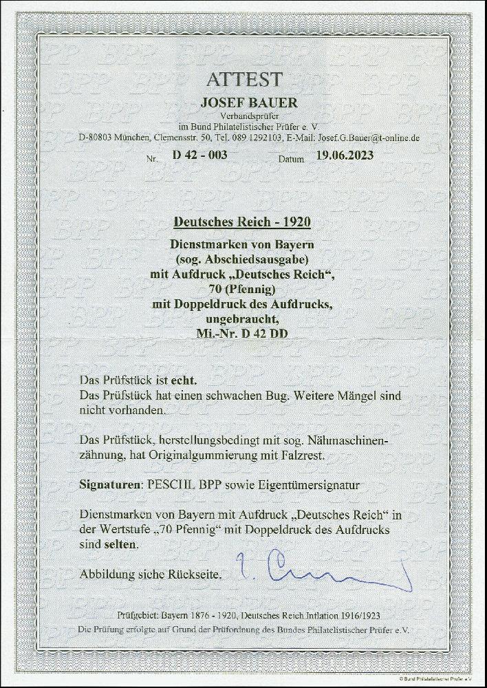 | Prüfer: | Bauer, Josef (BPP (Bund Philatelistischer Prüfer)) |