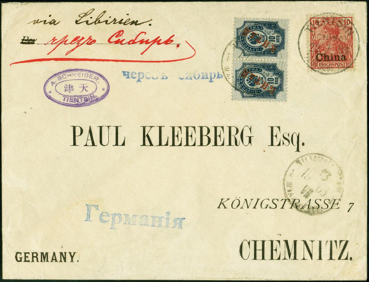 | Zusatzinformationen und Suchstichworte: | 383. Auktion Heinrich Köhler 14.–15. & 18.–23. März 2024 Los 2602 Deutsche Auslandspost China Versand über russische Postämter: 1903, Reichspost-Aufdruckausgabe 1901 10 Pfennig mit Stempel "TIENTSIN (CHINA) DP 22.7.03" auf Firmen-Briefkuvert mit Leitvermerk "via Sibirien" mit der chinesischen Post bis Newchwang befördert mit Ankunftsstempel und dann Postaufgabe mit waagerechtem Paar Russische Post China 10 Kopeken mit Stempel "FELDPOSTAMT No. 13 13.VIII.1903" sowie zwei russische Leitstempel "durch Sibirien" und "Germania" weiter nach Chemnitz befördert mit Ankunftsstempel. Der Umschlag mit Beförderungsspuren, sonst in guter Gesamterhaltung. In dieser Kombination mit der Beförderung durch drei verschiedenen Postorganisationen wohl einmaliger Brief, Fotobefund Mikulski Ausruf 500,00 EUR |