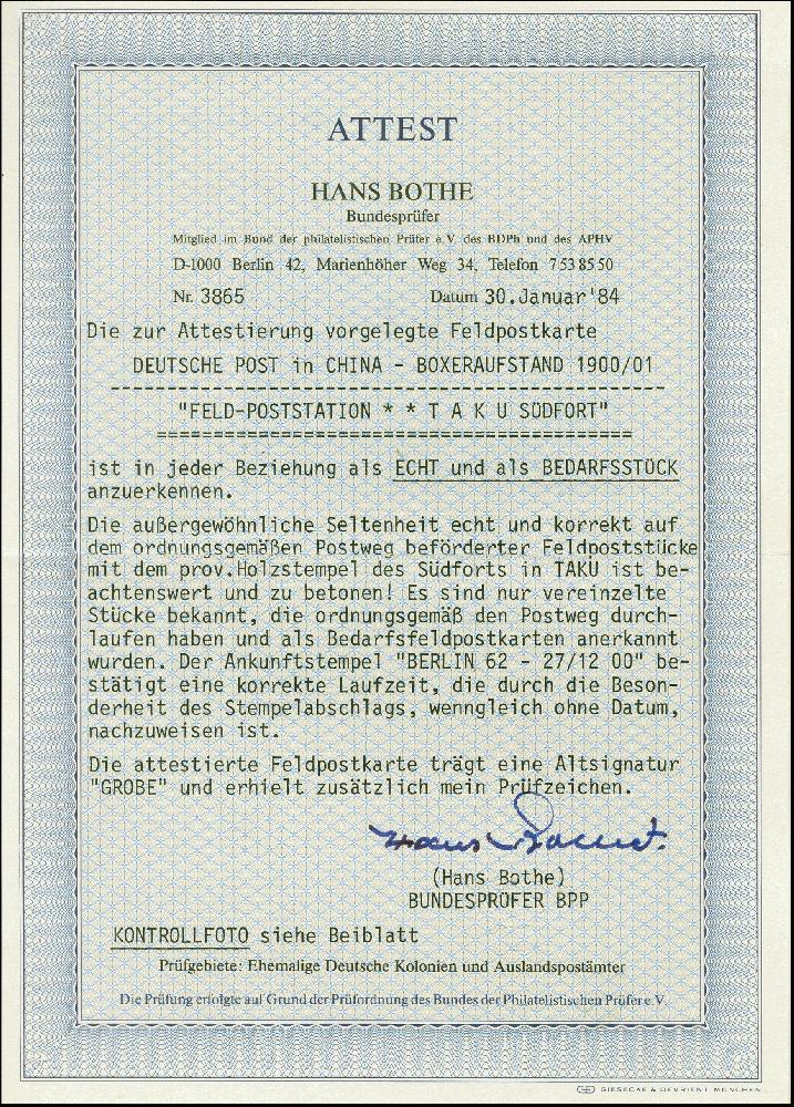| Zusatzinformationen und Suchstichworte: | 383. Auktion Heinrich Köhler 14.–15. & 18.–23. März 2024 Los 2667 Deutsche Auslandspost China 1900, "FELD-POSTATION ** TAKU SÜD-FORT", zweimal klar auf Feldpostkarte mit rückseitig aufgeklebter, farbiger Tuschezeichnung mit übergehendem Text nach Berlin mit vorderseitigem Ankunftsstempel und bis auf kleinem Eckbug in einwandfreier Erhaltung. Sicherlich einer der schönsten Bedarfskarten mit diesem seltenen Aufgabestempel, Fotoattest Bothe BPP (1984) Ausruf 500,00 EUR |
