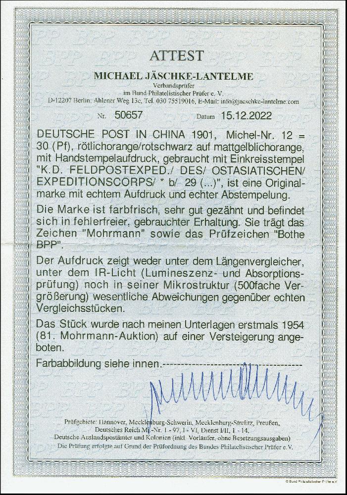 | Zusatzinformationen und Suchstichworte: | 383. Auktion Heinrich Köhler 14.–15. & 18.–23. März 2024 Los 2726 Deutsche Auslandspost China Handstempel 30 Pfg., farbfrisch und gut gezähnt, mit zentrischem "K.D.FELDPOSTEXPED. DES OSTASIATISCHEN EXPEDITIONSCORPS 29…" (Sorte I). Tadellos. Signiert Bothe und Mohrmann, Fotoattest Jäschke-L. BPP (2022) Ausruf 1.500,00 EUR |