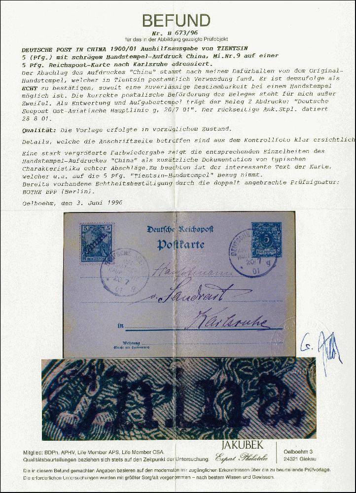 | Zusatzinformationen und Suchstichworte: | 383. Auktion Heinrich Köhler 14.–15. & 18.–23. März 2024 Los 7039 Deutsche Auslandspost China 1900, Handstempel 5 Pfennig mit Stempel "DSP OST-ASIATISCHE HAUPTLINIE g 20.7.01" als portogerechte Zufrankatur auf Krone/Adler Ganzsachenkarte 5 Pfennig mit Text über die Schiffsroute des Dampfers Bremen und über die Handstempel-Marke nach Karlsruhe mit Ankunftsstempel. Die Karte und Marke sind in einwandfreier Erhaltung, eine dekorative und seltene Mischfrankatur während des Boxer-Aufstandes Ausruf 500,00 EUR |