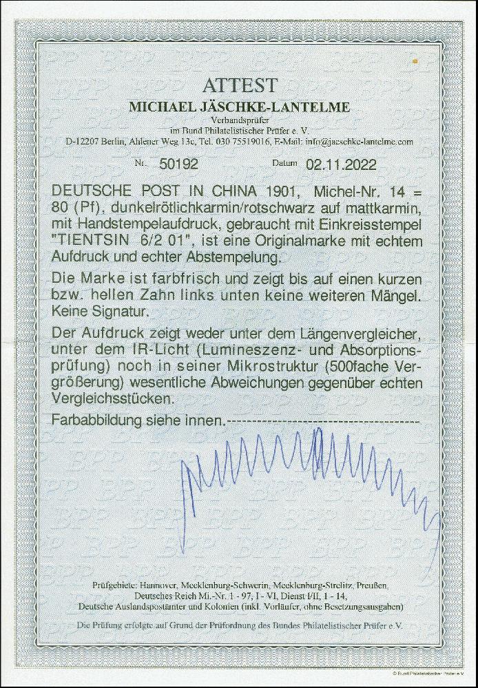 | Zusatzinformationen und Suchstichworte: | 383. Auktion Heinrich Köhler 14.–15. & 18.–23. März 2024 Los 7041 Deutsche Auslandspost China 1900, Handstempel 80 Pfennig mit Stempel "TIENTSIN DP 6.2.01", farbfrische Marke mit einem kurzen bzw. hellen Zahn, sonst in einwandfreier Erhaltung, ein schönes Exemplar dieser seltenen Marke mit Fotoattest Jäschke-L. BPP (2022) Ausruf 1.000,00 EUR |