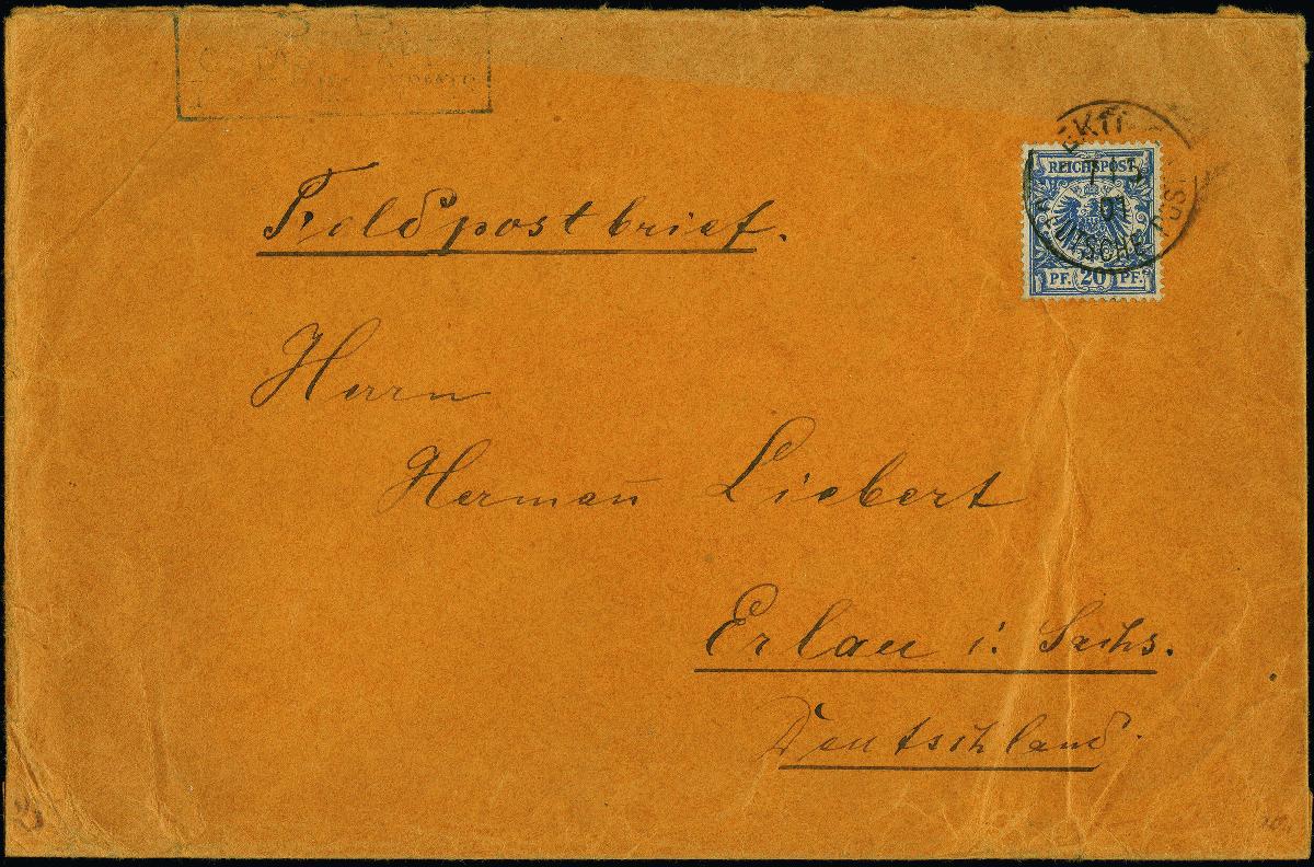 | Zusatzinformationen und Suchstichworte: | 383. Auktion Heinrich Köhler 14.–15. & 18.–23. März 2024 Los 7043 Deutsche Auslandspost China 1900, Krone/Adler 20 Pfennig mit "PEKING DP 7.5.01" als portogerechte Einzelfrankatur auf Feldpostbrief mit Briefstempel nach Erlau mit Ankunftsstempel. Der Umschlag mit Alterungs- und Beförderungsspuren, die Marke in einwandfreier Erhaltung. Sehr seltene Verwendung während der Boxer-Unruhen im Petschili-Gebiet Ausruf 500,00 EUR |