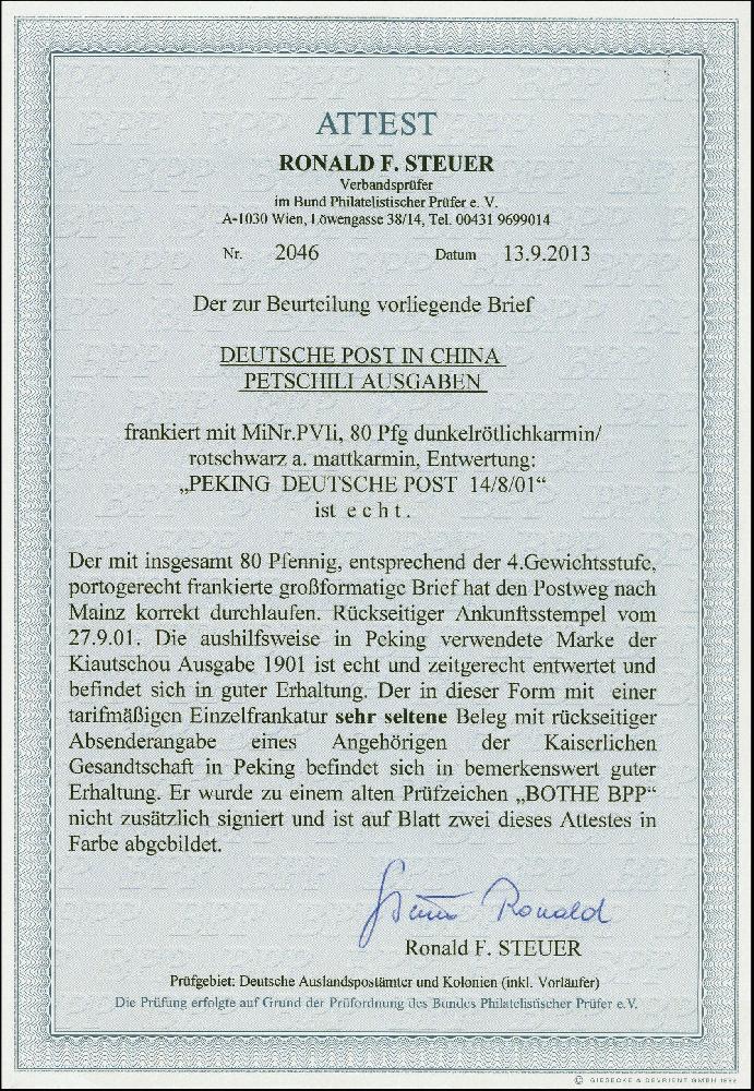 | Zusatzinformationen und Suchstichworte: | 383. Auktion Heinrich Köhler 14.–15. & 18.–23. März 2024 Los 7047 Deutsche Auslandspost China 1901, Kiautschou Kaiseryacht 80 Pfennig mit EKr. "PEKING DP 14.8.01" als portogerechte Einzelfrankatur auf langformatigem Briefumschlag der 4. Gewichtsstufe mit rückseitiger Absenderangabe von einem Angehörigen der Kaiserlichen Gesandtschaft nach Mainz mit Ankunftsstempel. Der im gefalteten Zustand beförderte Umschlag hat links ein Öffnungsschnitt und ist senkrecht gefaltet, sonst wie die Marke in einwandfreier Erhaltung. Eine sehr seltene Einzelfrankatur aus dem Bedarf während des Boxeraufstandes im Petschili-Gebiet, signiert Kruschel und Bothe BPP und Fotoattest Jäschke-L. BPP (2022) Ausruf 400,00 EUR |
