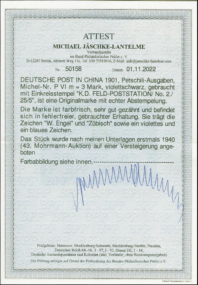 | Prüfgebiet: | Deutsche Auslandspostämter China Petschili-Ausgaben |