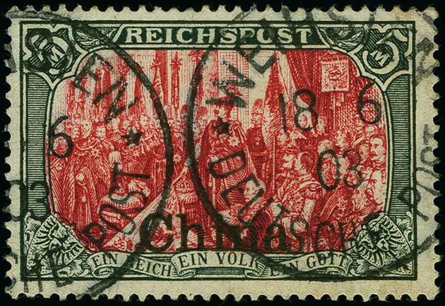 | Zusatzinformationen und Suchstichworte: | 383. Auktion Heinrich Köhler 14.–15. & 18.–23. März 2024 Los 7055 Deutsche Auslandspost China 1901, 5 Mark in Type I mit Nachmalung nur mit Deckweiß, sauber gestempelt, in tadelloser Erhaltung mit Fotoattest Jäschke-L. BPP (2022) Ausruf 100,00 EUR |