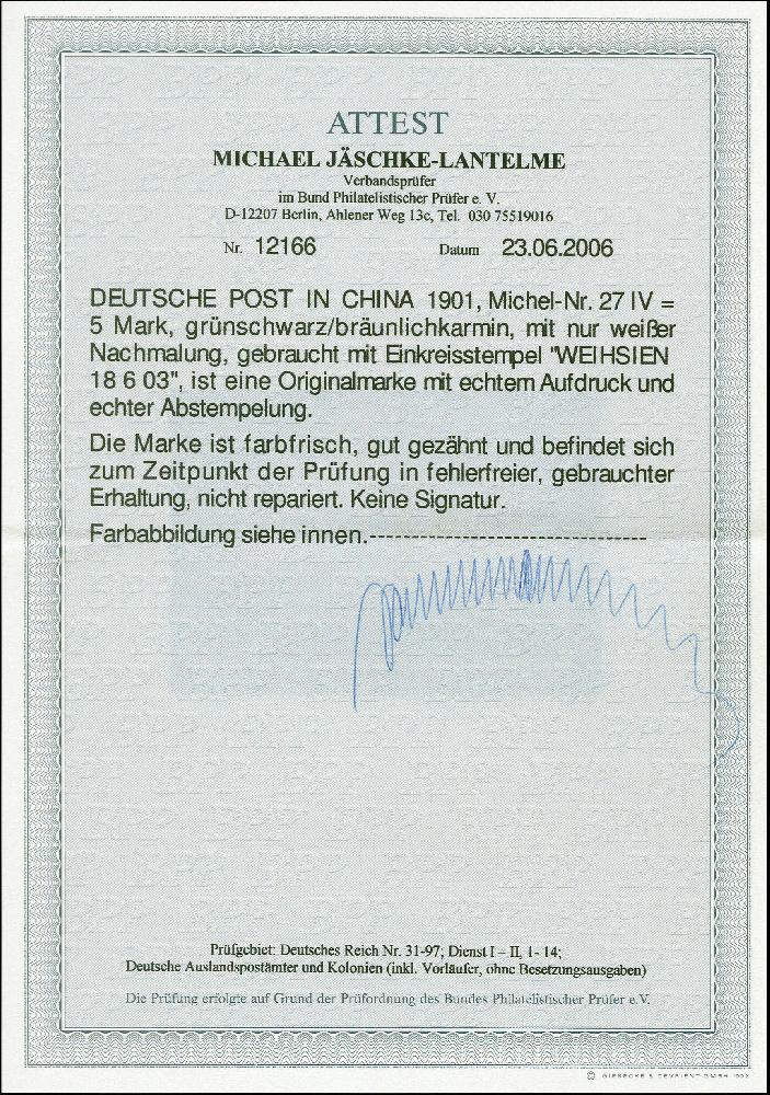 | Prüfer: | Jäschke-Lantelme, Michael (BPP (Bund Philatelistischer Prüfer)) |