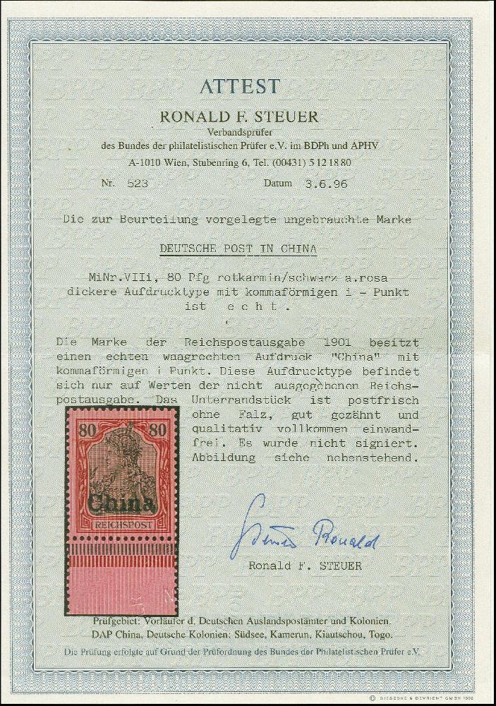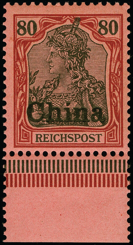 | Zusatzinformationen und Suchstichworte: | 383. Auktion Heinrich Köhler 14.–15. & 18.–23. März 2024 Los 7056 Deutsche Auslandspost China 1901, amtlich nicht ausgegeben: Germania-Reichspost 80 Pfennig mit dickerer Aufdrucktype mit kommaförmigen i-Punkt, Unterrandstück, postfrisch, in tadelloser Erhaltung, unsigniert mit Fotoattest R. Steuer BPP (1996) Ausruf 200,00 EUR |