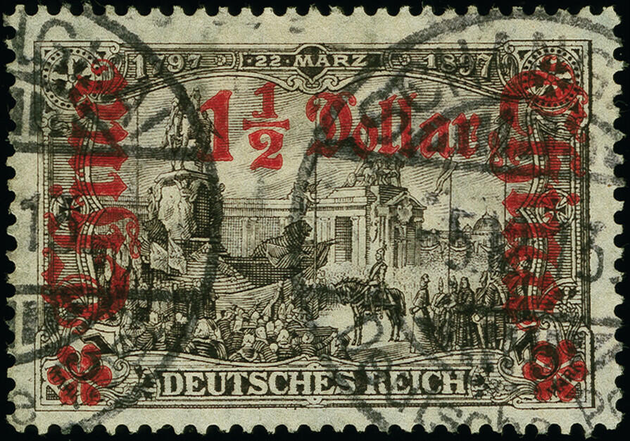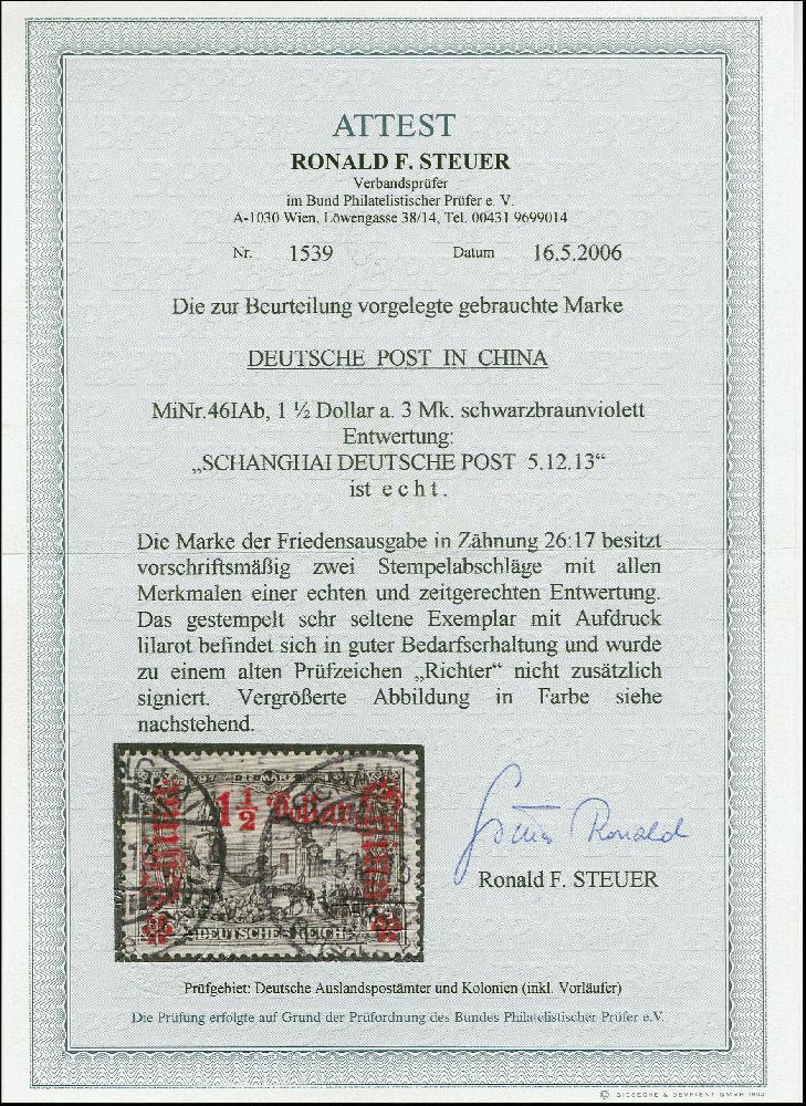 | Zusatzinformationen und Suchstichworte: | 383. Auktion Heinrich Köhler 14.–15. & 18.–23. März 2024 Los 7060 Deutsche Auslandspost China 1906/19, Friedensdruck 1 ½ Dollar auf 3 Mark schwarzbraunviolett, Zähnungslöcher 26:17, mit Wertaufdruck nach rechts in lilarot, sauber gestempelt, tadellos, sehr seltene Marke, signiert Richter und Fotoattest R. Steuer BPP (2006) Ausruf 300,00 EUR |