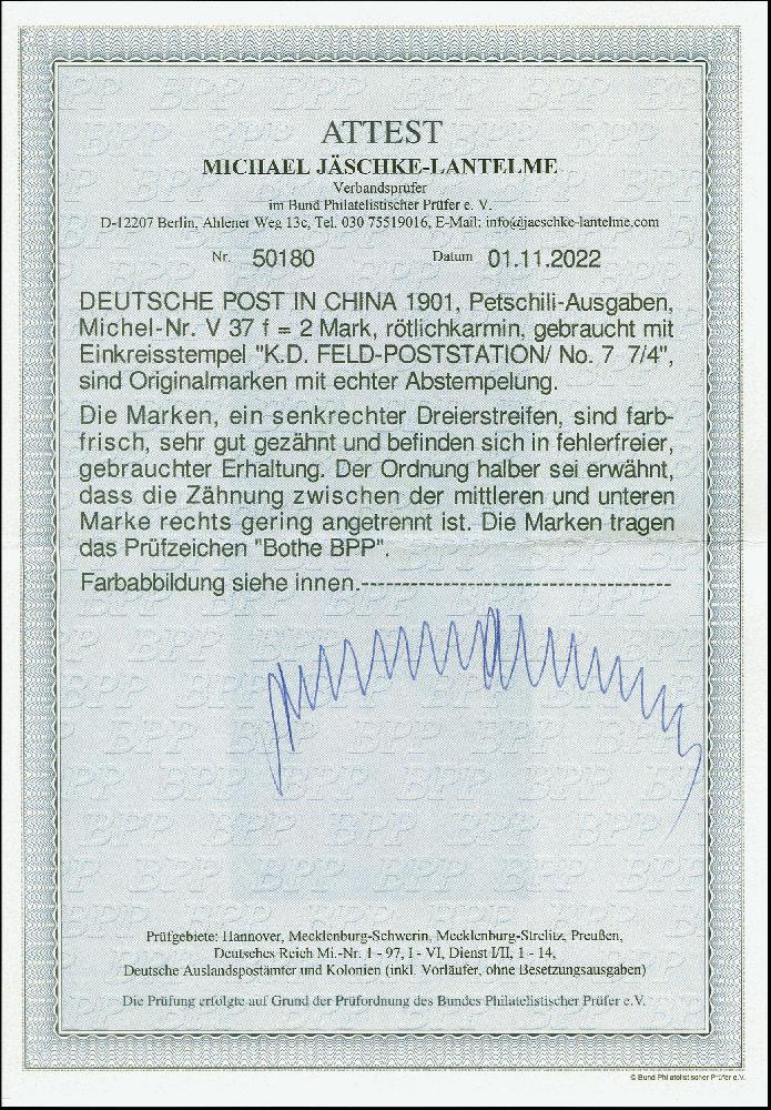 | Zusatzinformationen und Suchstichworte: | 383. Auktion Heinrich Köhler 14.–15. & 18.–23. März 2024 Los 7031 Deutsche Auslandspost China 1901, 2 Mark rötlichkarmin im senkrechten Dreierstreifen je mit klarem EKr. "K.D. FELD-POSTSTATION No.7 7.4.". Die farbfrische und dekorative Einheit ist gering angetrennt, sonst in tadelloser Erhaltung, signiert Bothe BPP und Fotoattest Jäschke-L. BPP (2022) Ausruf 150,00 EUR |