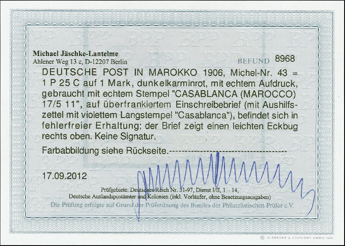 | Prüfgebiet: | Deutsche Auslandspostämter Marokko |