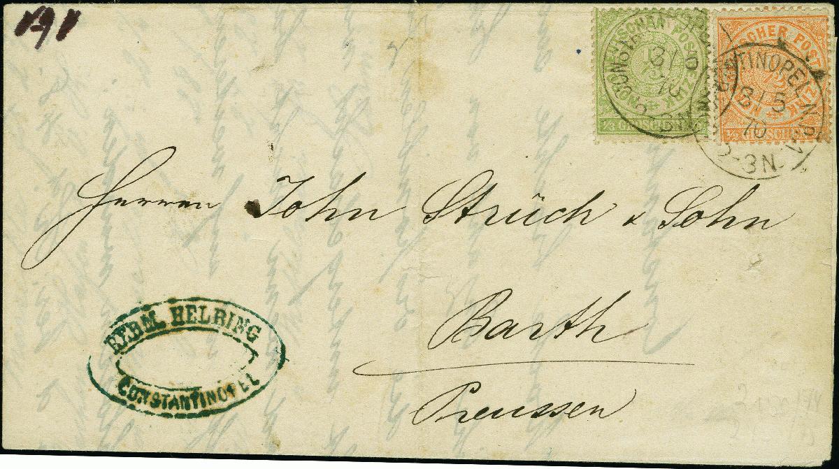 | Zusatzinformationen und Suchstichworte: | 383. Auktion Heinrich Köhler 14.–15. & 18.–23. März 2024 Los 6536 Deutsche Auslandspost Türkei, Vorläufer NDP ⅓ Groschen grün und ½ Groschen orange, farbfrisch und gut gezähnt, mit jeweils sauber aufgesetztem EKr. "CONSTANTINOPEL N. P. A.3/5 70" auf kompletter Drucksache nach Barth in Preußen, mit rückseitigem Ausgabestempel. Im Briefpapier belangloses kleines Loch und kleine Beschriftung, sonst einwandfreie und schöne Erhaltung. Ein außerordentlich seltenes Stück Ausruf 3.000,00 EUR |