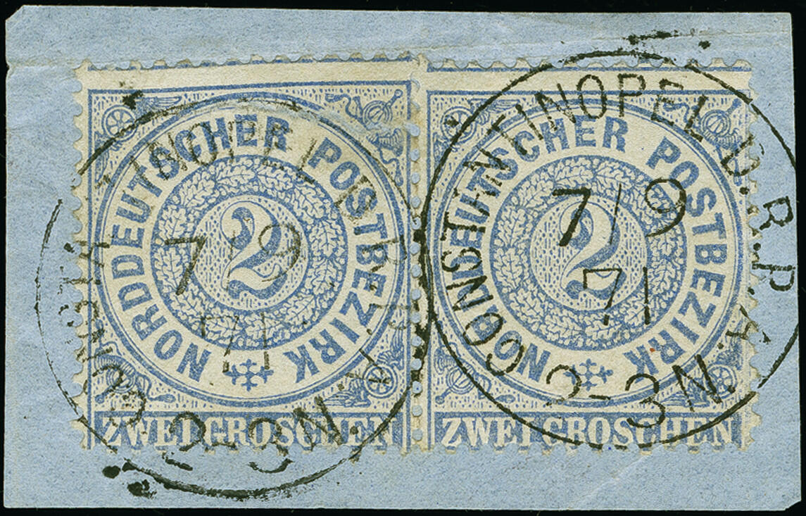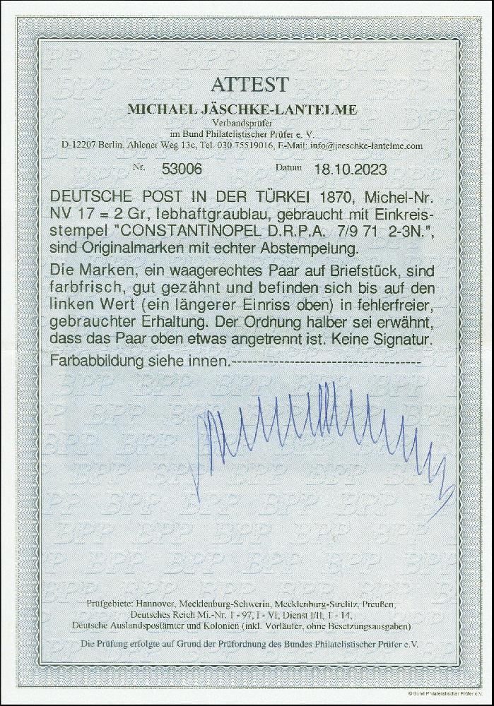 | Zusatzinformationen und Suchstichworte: | 383. Auktion Heinrich Köhler 14.–15. & 18.–23. März 2024 Los 6541 Deutsche Auslandspost Türkei, Vorläufer NDP 2 Groschen ultramarin im waagerechten Paar (angetrennt), mit jeweils sauber aufgesetztem "CONSTANTINOPEL D.R.P.A. 7/9.71" auf Briefstück. Die linke Marke mit Einriss, sonst tadellos. Ein schönes Belegstück des seltenen Stempels. Fotoattest Jäschke-L. BPP (2023) Ausruf 800,00 EUR |