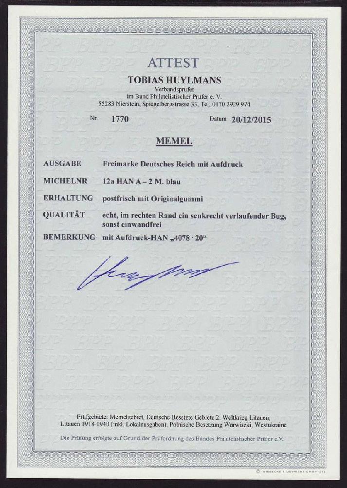 | Zusatzinformationen und Suchstichworte: | Christian E. Geigle Briefmarkenfachhandel Los 0003131299 Memel 1920, Repräsentative Darstellungen mit Aufdruck, 2 M. blau, postfrisches Prachtstück mit anhängender, sehr seltener Aufdruck-HAN "4078.20", im rechten Markenrand befindet sich ein unscheinbarer, senkrecht verlaufender Bug, unsigniert mit FA Huylmans "sonst einwandfrei". Festpreis 125,00 EUR |