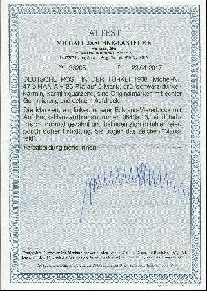 | Zusatzinformationen und Suchstichworte: | 383. Auktion Heinrich Köhler 14.–15. & 18.–23. März 2024 Los 2733 Deutsche Auslandspost Türkei 1908, 25 Pia a. 5M grünschwarz/dunkelkarmin (karmin quarzend), Viererblock aus der linken unteren Bogenecke, mit HAN-Nr. "3643a.13", postfrisch, tadellos, Fotoattest Jäschke-L. BPP (2017) Ausruf 90,00 EUR |
