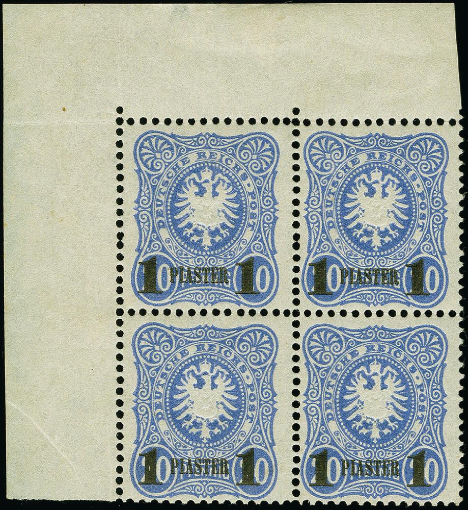 | Zusatzinformationen und Suchstichworte: | 383. Auktion Heinrich Köhler 14.–15. & 18.–23. März 2024 Los 6558 Deutsche Auslandspost Türkei 1 Pia. auf 20 Pfg. dunkelultramarin im Viererblock aus der linken oberen Bogenecke, die linken Werte im breiten Format, ungebraucht, die unteren Werte postfrisch. Bogenrand vorgefaltet und leicht fehlerhaft, Marken tadellos. Ein Wert private Signatur, Fotoattest Jäschke-L. BPP (2023) Ausruf 200,00 EUR |