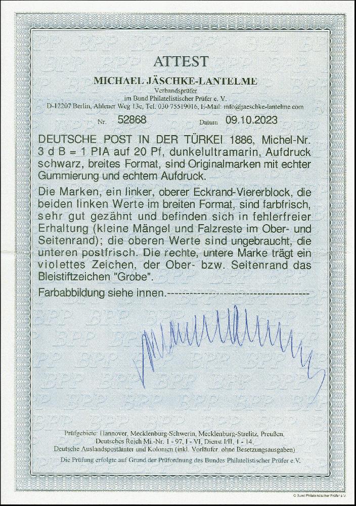 | Prüfer: | Jäschke-Lantelme, Michael (BPP (Bund Philatelistischer Prüfer)) |