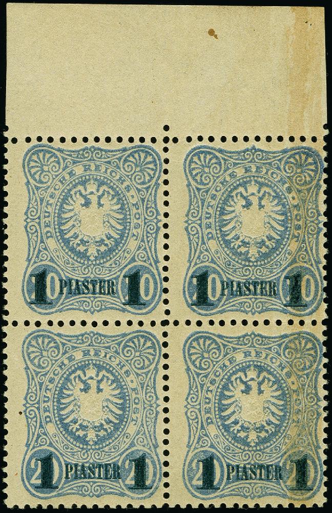 | Zusatzinformationen und Suchstichworte: | 383. Auktion Heinrich Köhler 14.–15. & 18.–23. März 2024 Los 6560 Deutsche Auslandspost Türkei 1 Pia. auf 20 Pfg. mittelultramarin, Aufdruck schwarzblau, der amtliche Neudruck für Kosack, im Oberrand-Viererblock, farbfrisch und sehr gut gezähnt, postfrisch (im Bogenrand kleine Haftstelle). Frische und einwandfreie Erhaltung (ein bräunlicher (Gummi-) Streifen rechts ist herstellungsbedingt). Eine in dieser Form sehr seltene Einheit. Signiert v. Willman und Fotoattest Jäschke-L. BPP (2023) Ausruf 1.000,00 EUR |